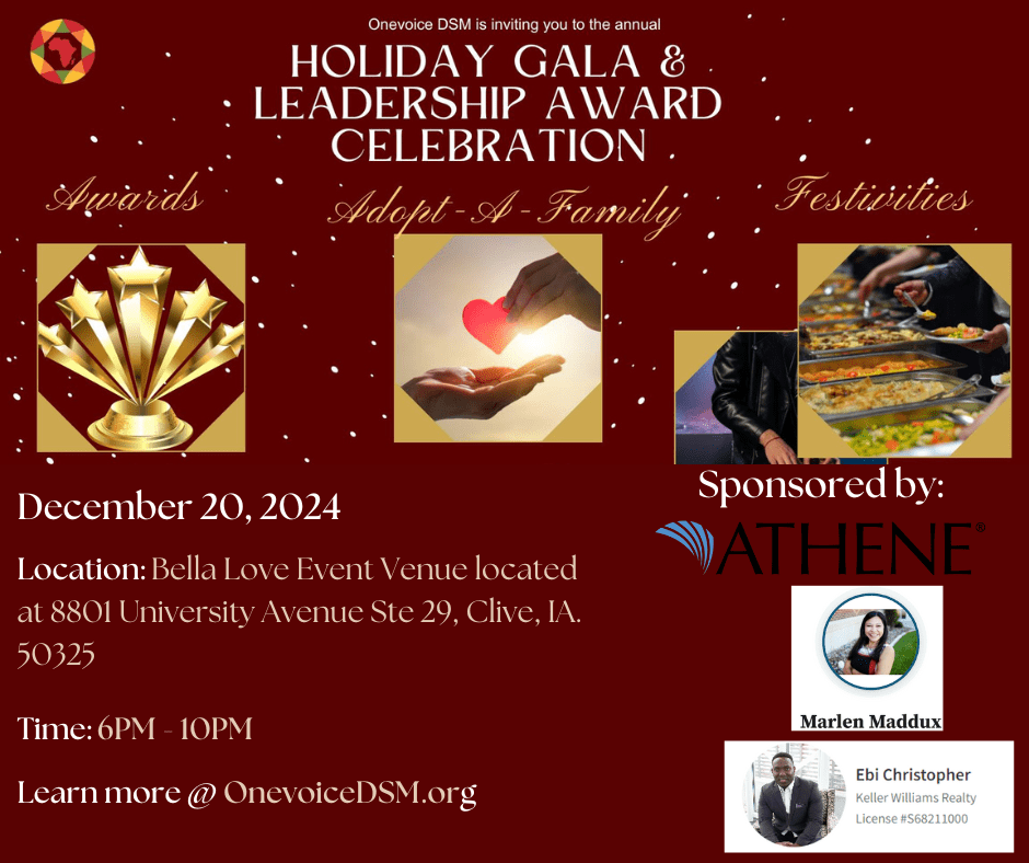 Each year, One Voice DSM hosts an incredible holiday celebration to ring in the new year, celebrate leaders who are making incredible impacts in our community, and give a generous donation to members of our community who are in need. This year’s event took place at Bella Love Event Venue located at 8801 University Avenue Ste 29, Clive, IA. 50325 on December 20th 2024 at 6PM.